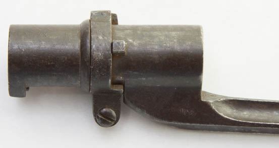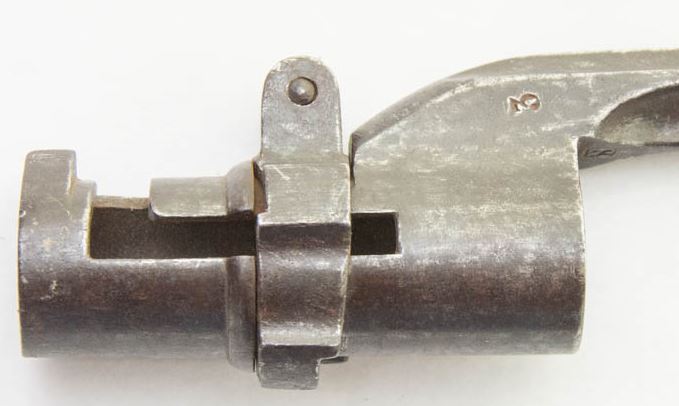 Douille: A triple fente pour tenon dessous. Pontet tourné du côté du coude. Virole médiane à double pontet pour fixation de la baïonnette tantôt au bout du fusil, tantôt en position retournée.