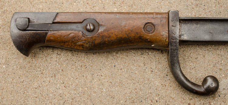 Poignée: Pommeau et croisière en acier. Plaquettes en bois. La poignée d'origine du modèle 1882 belge, a subi un certain nombre de modifications: le quillon tourné vers l'avant a été conservé, mais la bague de croisière a été supprimée par recoupage rectiligne à 2 mm du dos de la poignée. La rainure de fixation a été légèrement élargie et elle a été allongée, passant de 30 à 43 mm. Son profil en T a été mis en forme de trèfle pour permettre le logement de la baguette du fusil. Le ressort extérieur plat situé à droite est désormais équipé d'un poussoir proéminent dans lequel pénètre l'extrémité du ressort. Il correspond à l'opposé, à un verrou de forme asymétrique, arrondi d'un côté, rectiligne de l'autre. Les têtes bombées du rivet le plus proche de la croisière ont été arasées et la vis qui tient le ressort à droite fait face à une petite vis arasée à fente du côté gauche.