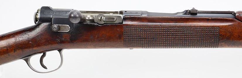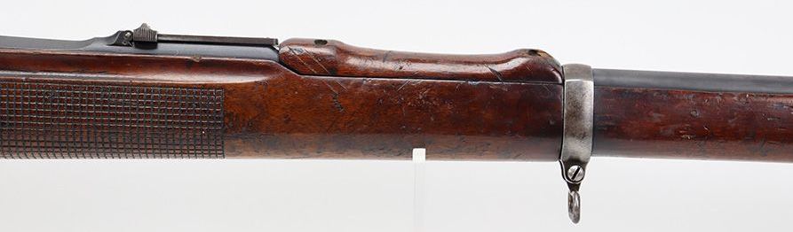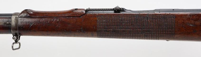 La monture, en bois est d'une seule, à crosse anglaise et fût étoffé. Ce dernier reçoit un quadrillage à damiers. Un garde-main très court recouvre le canon entre la hausse et la grenadière. La culasse mobile est à verrou, la tête est mobile. Le levier d'armement est droit, le percuteur est mû par un ressort placé dans le verrou. Le verrouillage s'effectue par appui de l'embase du levier d'armement sur la boîte de culasse et par un tenon placé à l'arrière.
