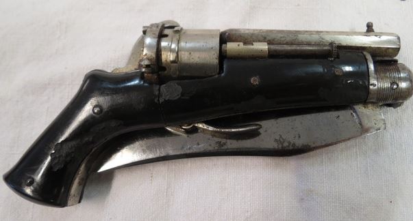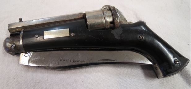 Il existe quelques rares modèles de luxe, discrètement gravés et montés en ivoire. A l'origine, les pièces métalliques du revolver sont entièrement nickelées comme les mitres du couteau. La lame est de frome yatagan, elle permet de tirer quel qui soit sa position, ouverte ou fermée.