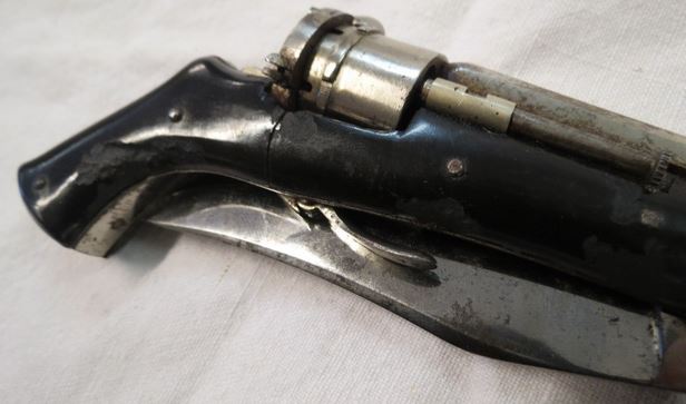 Ce revolver est dépourvu de plaquettes de crosse, il est inséré dans la poignée en corne du couteau. Une poignée surdimensionnée, travaillée en forme de crosse, qui ne laisse dépasser que le canon et le barillet. La queue de détente, qui commande le tir, est repliée dans l'armature. La baguette d'éjection se trouve sur la droite du canon. Cette arme fonctionne en double action. Sur la plupart des modèles, le chien est dépourvu de crête, mais ce n'est pas la règle.