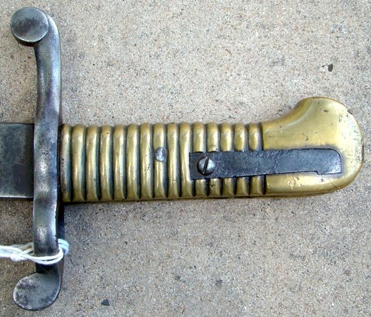 Poignée: En laiton, cannelée à 15 cordons. Pommeau assez massif, à bec. Ressort extérieur plat se terminant droit, tenu par deux vis à tête bombée à droite. Rainure de fixation en T avec chanfrein très peu marqué se continuant par une directrice qui s'arrête à la croisière. Rivure de la soie arasée au talon du pommeau. Rivet transversal arasé sur le 8ème cordon en partant de l'avant. Croisière assez mince, en acier à bague au ras du dos de la poignée avec retour vers la lame et quillon droit à rouleau plat terminal tourné également vers l'avant.