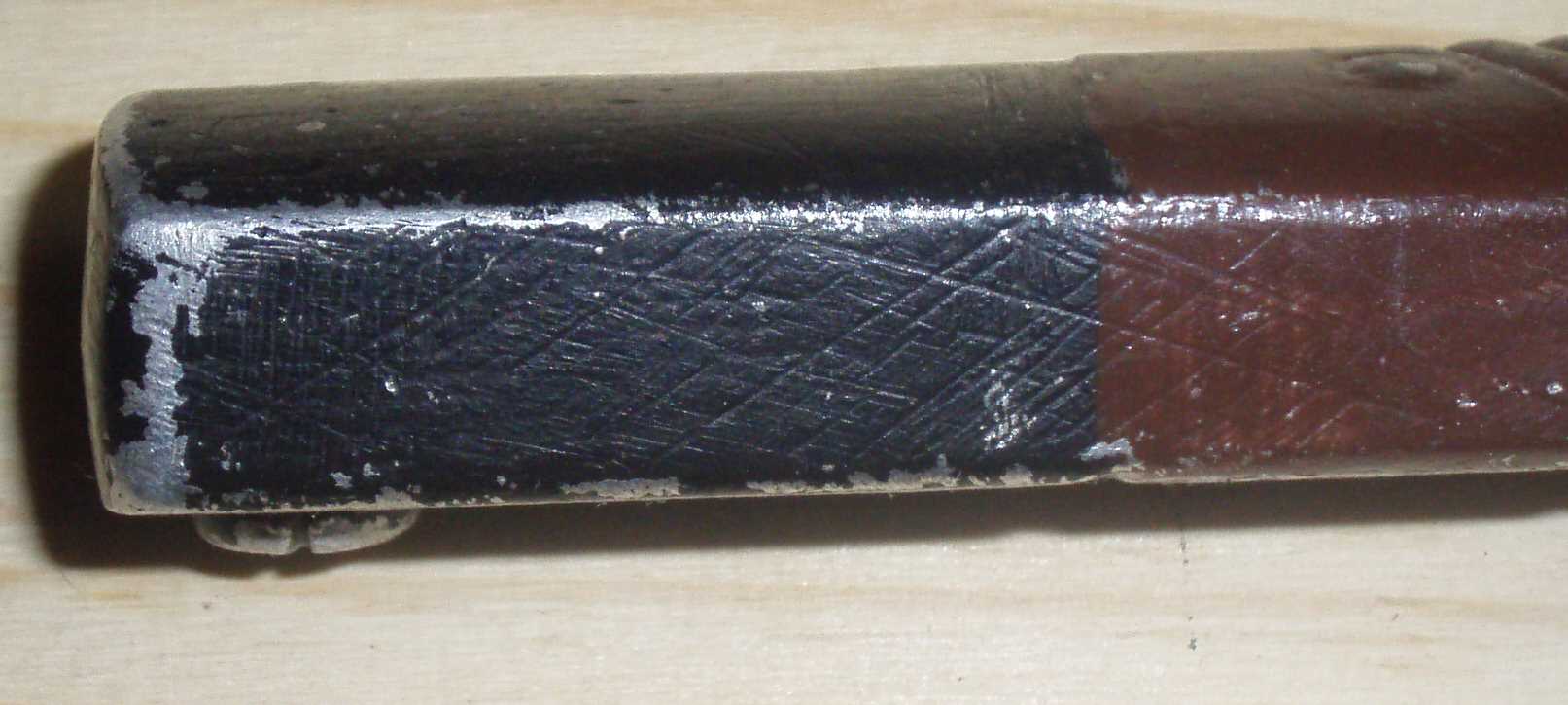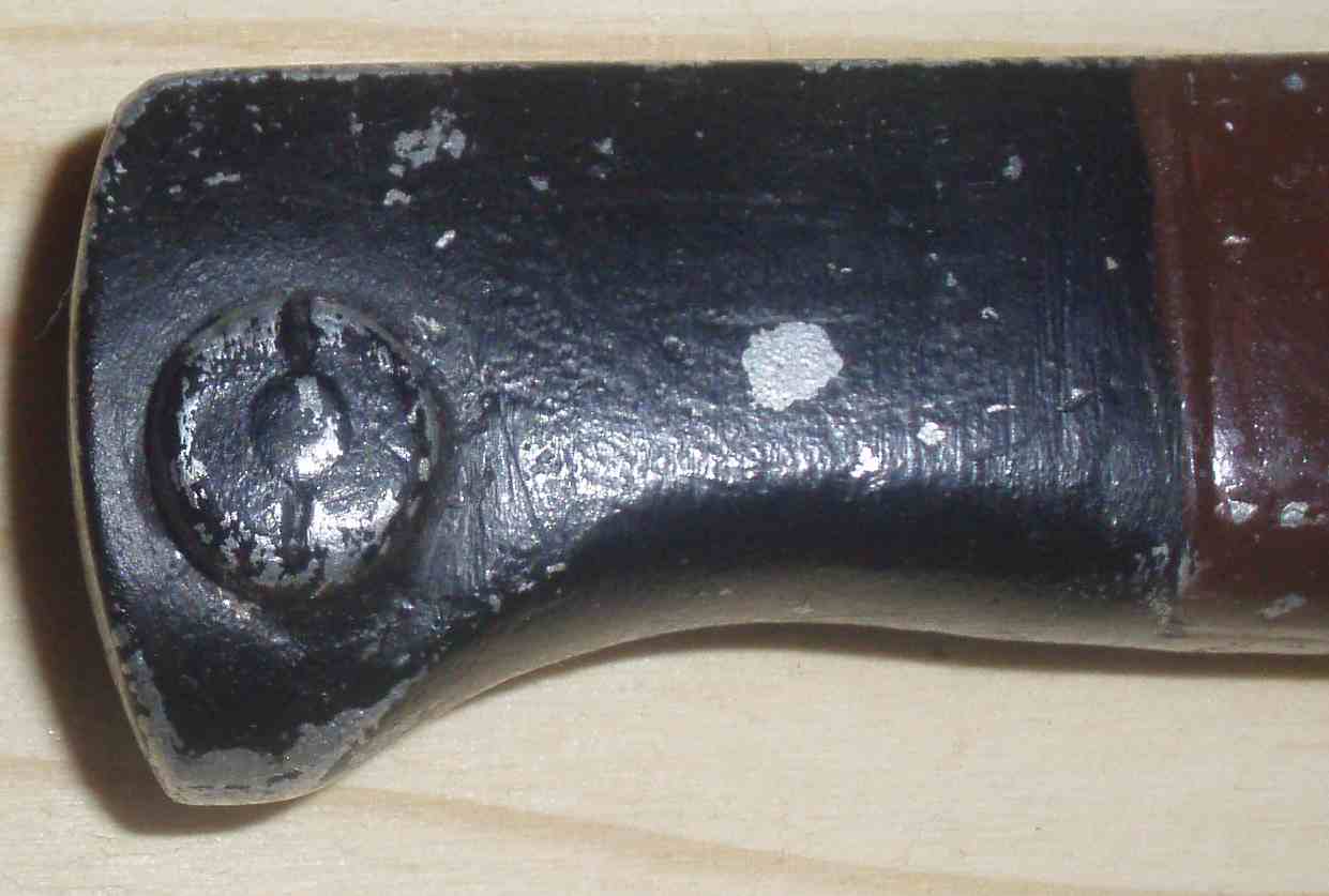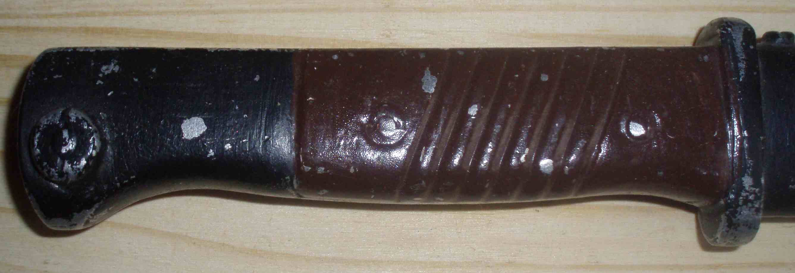 Poignée: C'est une imitation du modèle 84-98  3ème type, en aluminium moulé, d'une seule pièce avec le reste de la baïonnette. Des plaquettes à 7 stries obliques sont figurées et peintes en brun. Bouton-poussoir en relief et pièce de verrouillage en légère saillie. Croisière sans bague, propre au modèle.