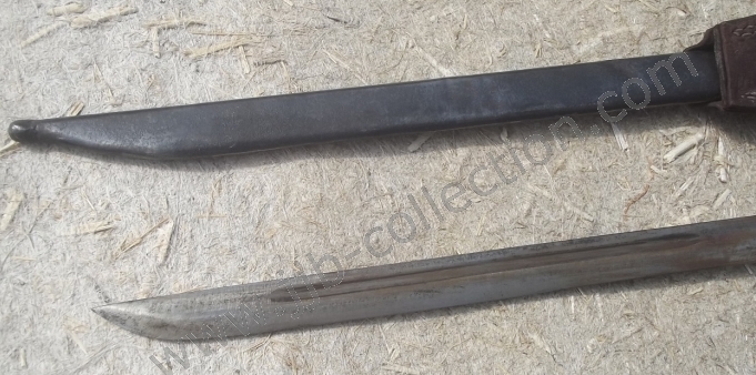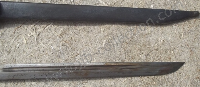 Lame: Peu épaisse, à dos et à un seul tranchant non aiguisé. Elle comporte le long du dos sur chaque face une étroite gouttière qui commence à 60 mm de la croisière et qui mesure 250 mm de longueur.