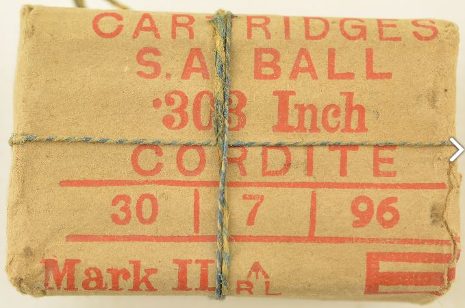 Paquet de 10 cartouches Mark II daté du 30/07/1896. Chargement à la cordite.