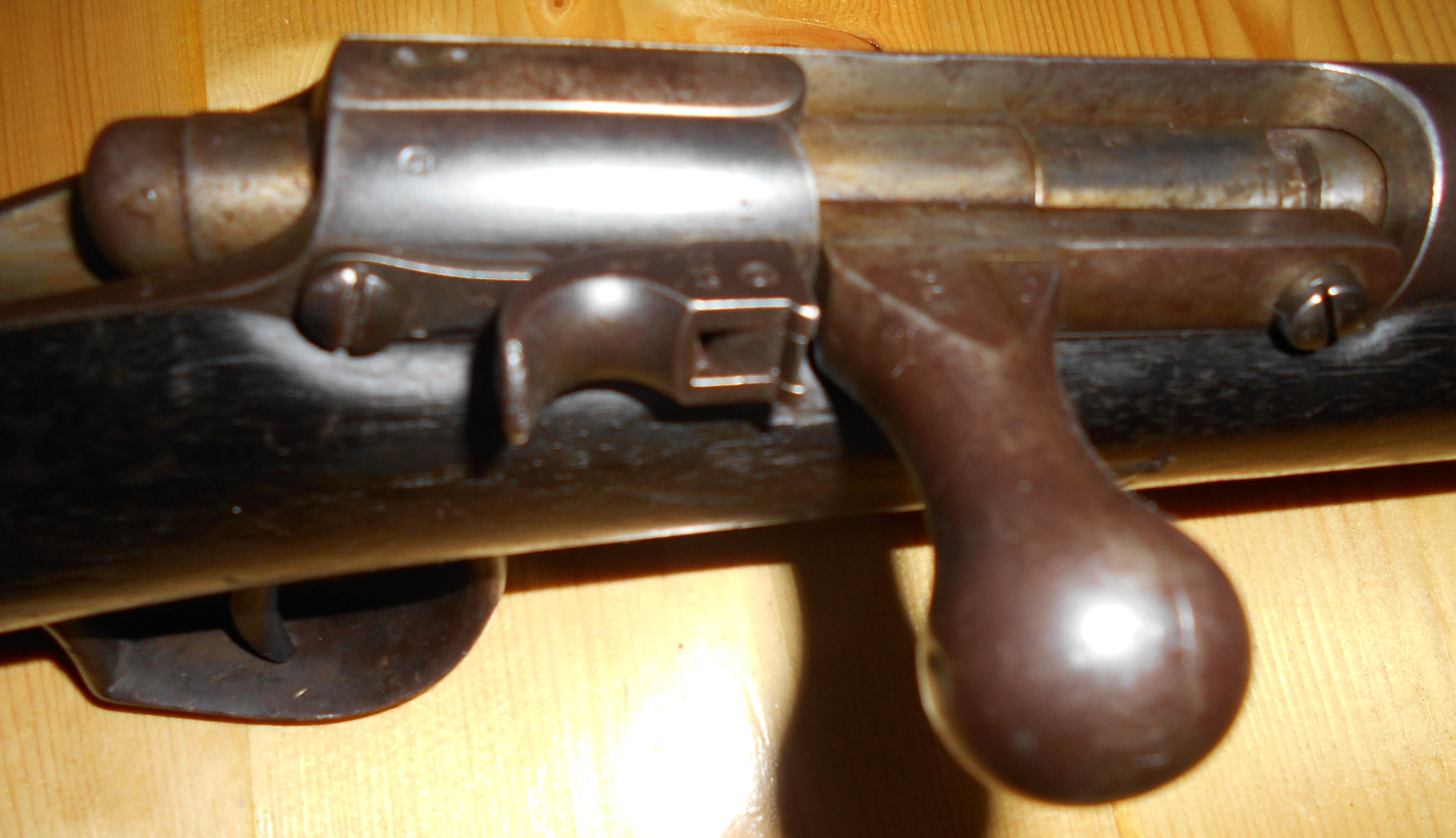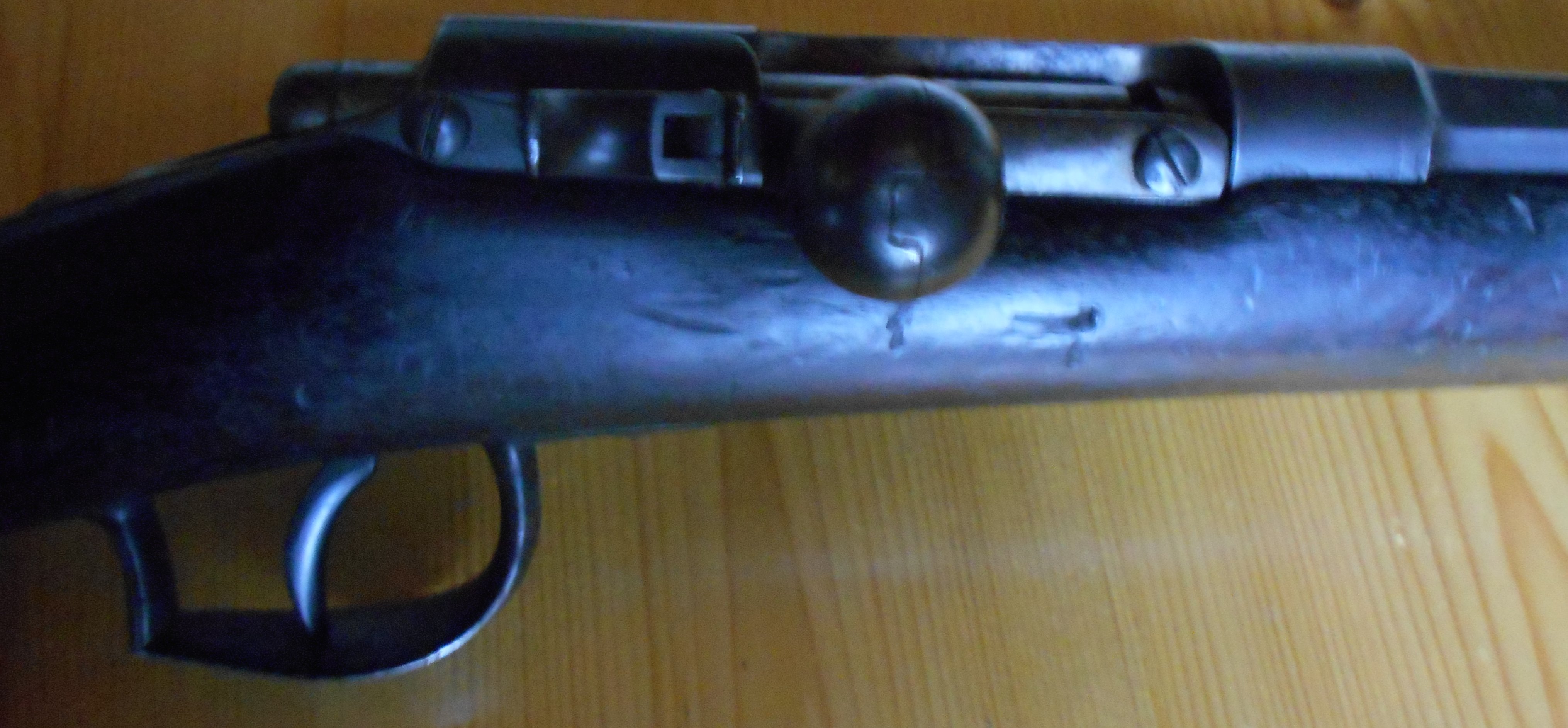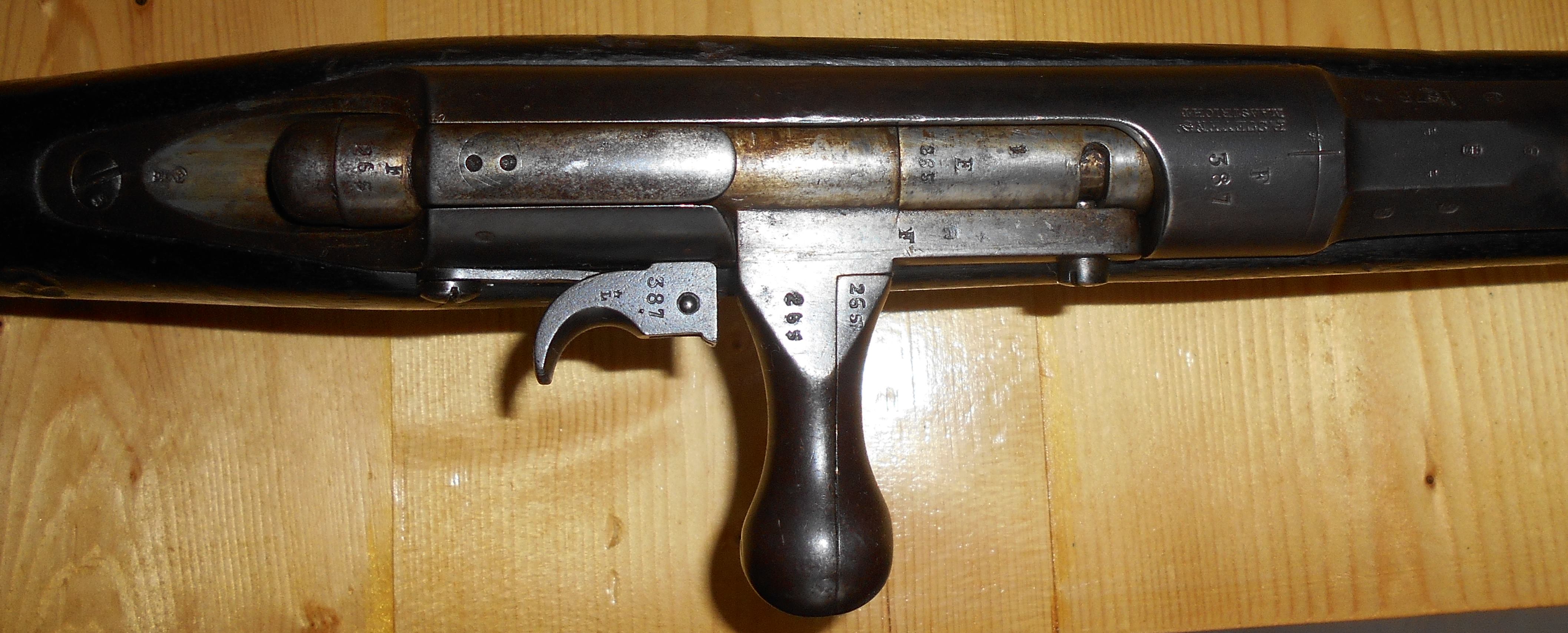 Cette arme ne comporte pas de magasin et possède une sécurité du côté droit qui fixe le verrou en position demi-fermé.