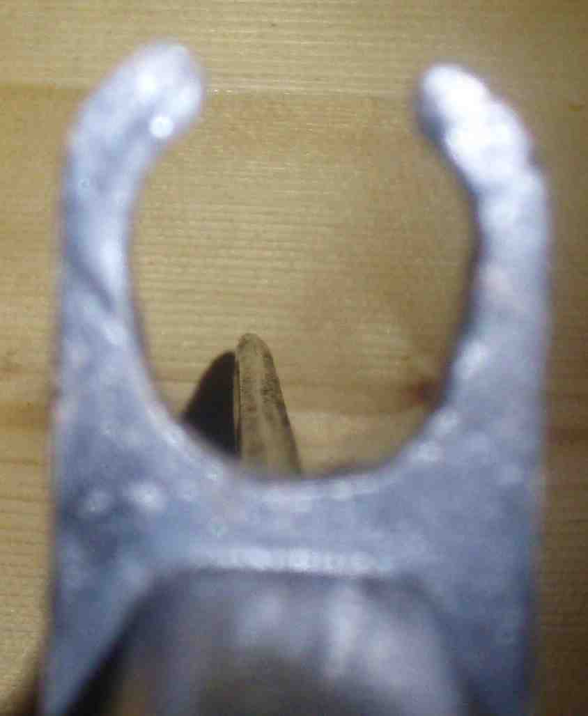 Poignée: tout acier, peinte en feldgrau d'origine. Croisière faite en deux parties superposées. Trou rond de nettoyage au contact de la croisière.