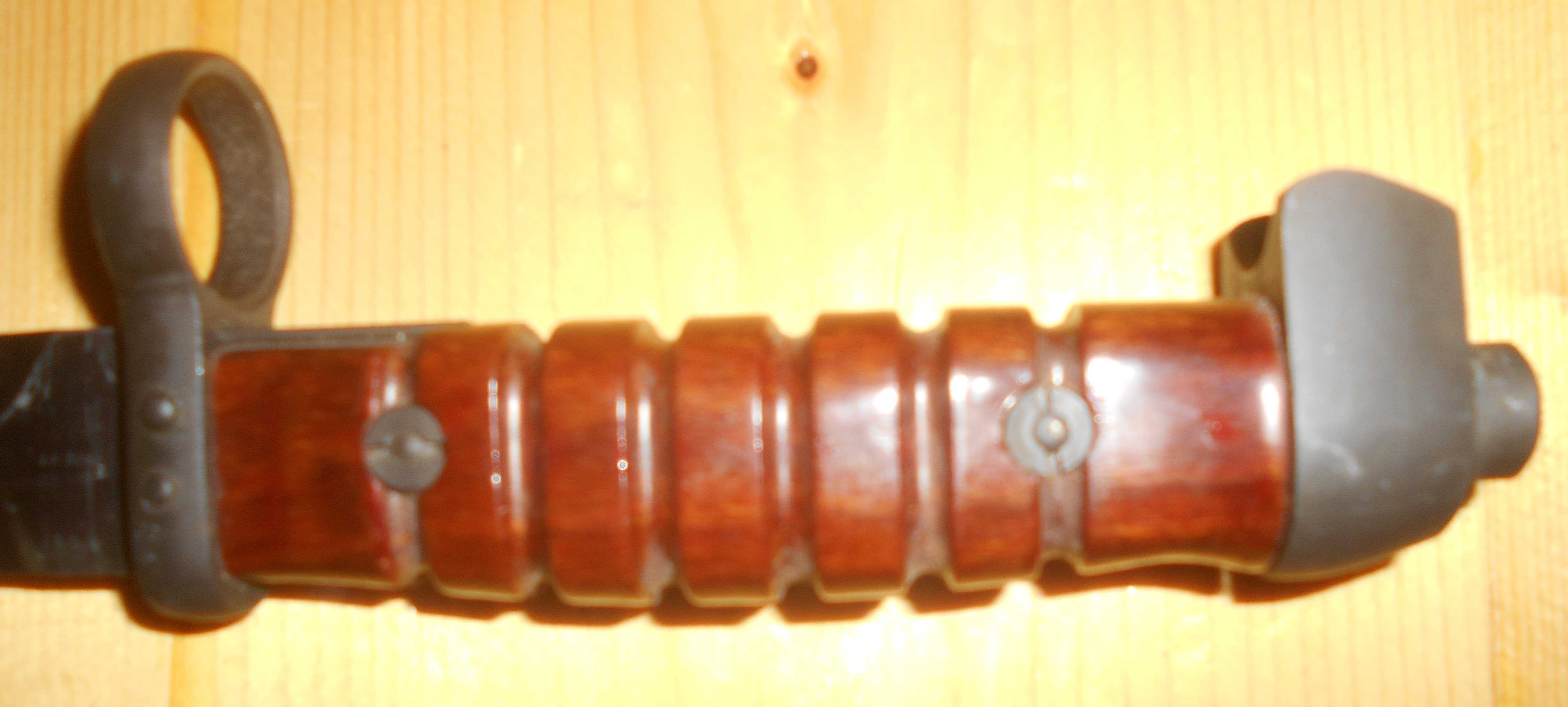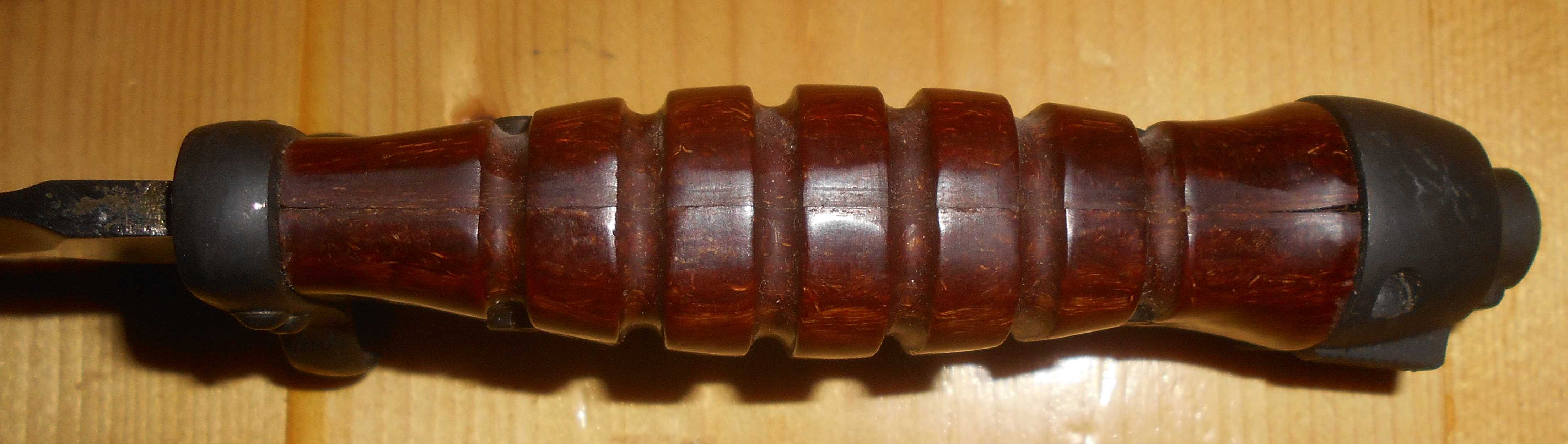 Poignée: A six cannelures, en matière plastique brune ou rougeâtre. Elle est fixée par deux vis. Croisière tenue par deux petits rivets apparents, à bague et sans quillon.