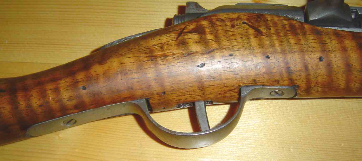 L'ensemble canon monture est relié au moyen d'une grenadière et d'un embouchoir, un trou est percé en bout, laissant à penser que l'arme est équipée d'une baguette, (absente sur l'exemplaire photographié).