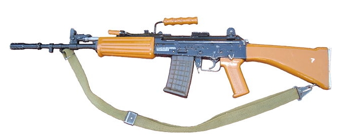 Fusil-mitrailleur muni d'un bipied et d'une crosse fixe avec épaulière ou d'une crosse pliante.