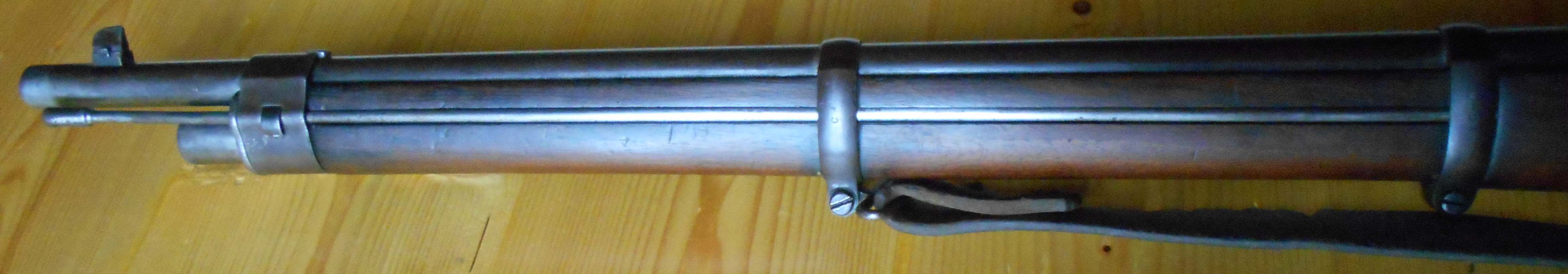 Le canon de section ronde est maintenu au fût par une capucine, une grenadière et un embouchoir.