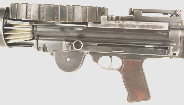 Le mécanisme d'alimentation se compose d'un tambour horizontal, amovible. Sa partie centrale servant de guide est fixe et la périphérie, où sont stockées les cartouches, est mobile.
