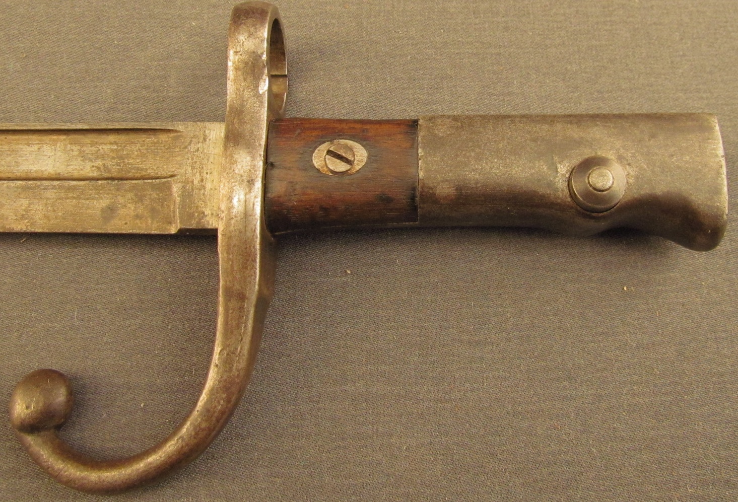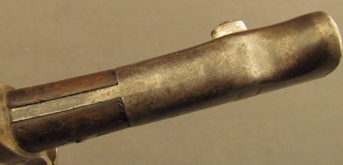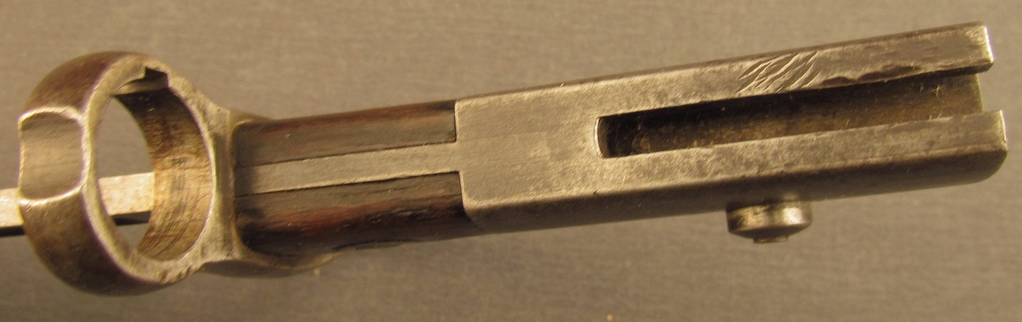 Poignée: En acier. Très long pommeau avec très courtes plaquettes en bois de 28 mm de long, maintenues par une seule vis en cuvette ovale.