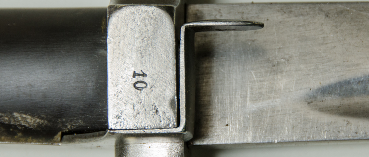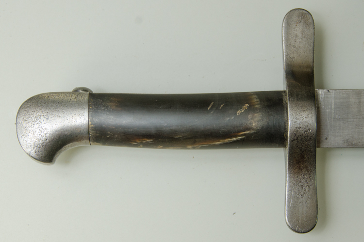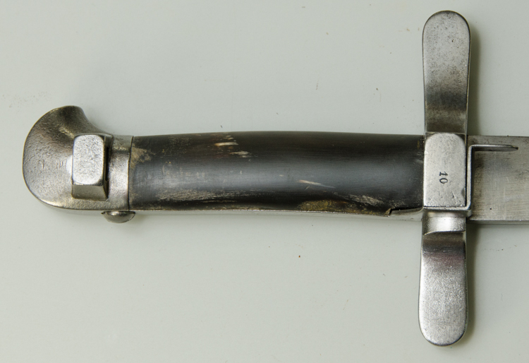 Remarques: Cette baïonnette à forte lame yatagan et à poignée en corne est typiquement belge. Ce mode de fixation est dit pour carabine à tige ce qui tiendrait à la présenter comme militaire, mais aucun modèle réglementaire n'est connu. En fait, il existe de très nombreuses baïonnettes civiles de ce système.