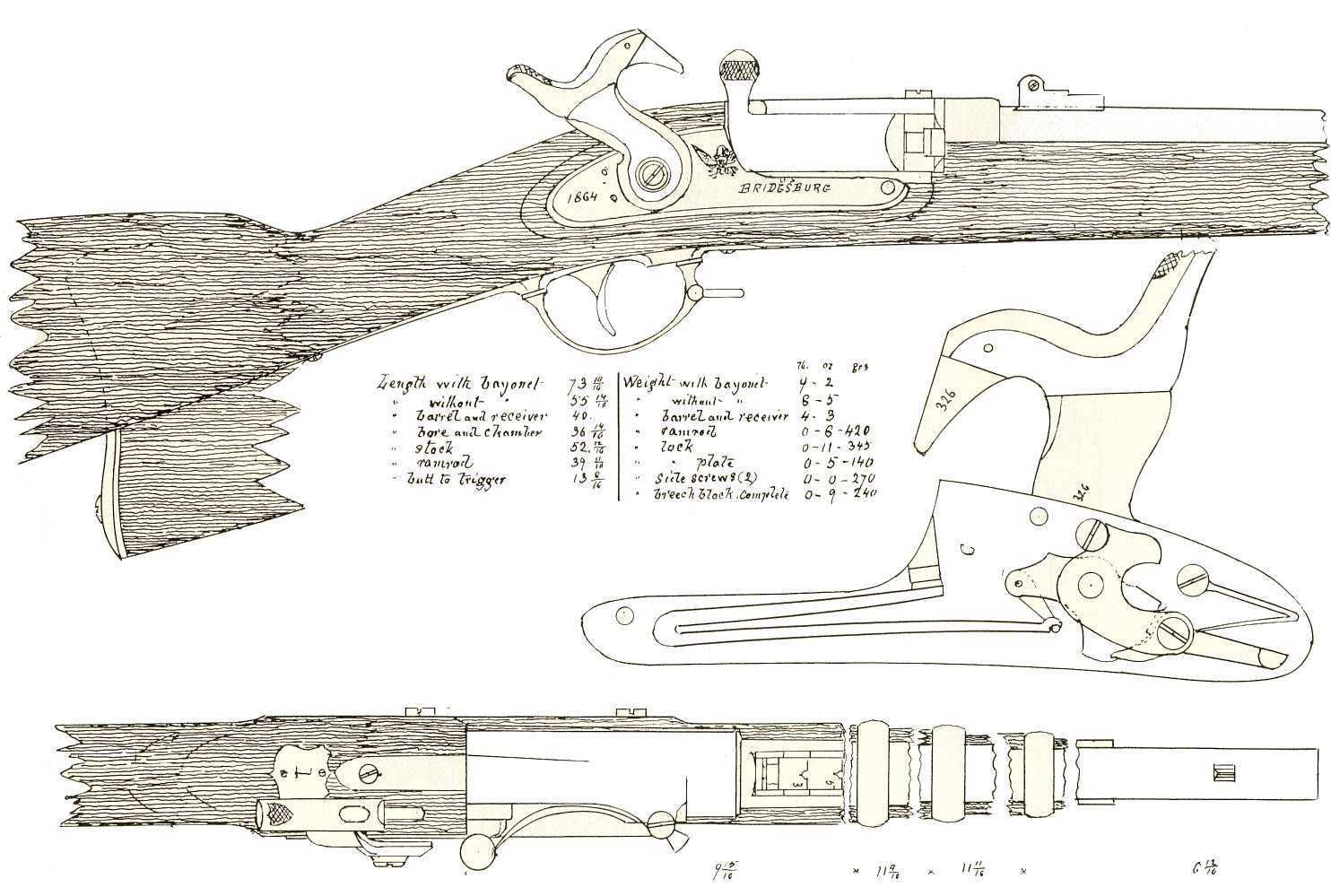 L'arme conserve du fusil initial non seulement le canon coupé à l'arrière pour la mise en place du bloc de culasse mais également la monture en noyer retaillée, les éléments de visée, les garnitures et la platine originale, le chien quant à lui ayant été remplacé par un élément nouveau muni d'un prolongement long et pointu ayant pour objet d'actionner le percuteur monté dans le bloc basculant. Le nouveau bloc de culasse présente de grandes similitudes avec celui de la conversion Suisse type "Milbank-Amsler" mais articulé par la droite.