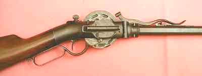 La rotation du barillet est assurée par le levier de sous-garde qui arme également un chien latéral placé sur la droite du magasin d'amorces.