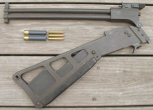La crosse pliante est en tôle emboutie, son verrouillage s'effectue au moyen d'un étrier sur la partie supérieure. L'intérieur de la crosse est aménagé afin de constituer une réserve de cartouches.