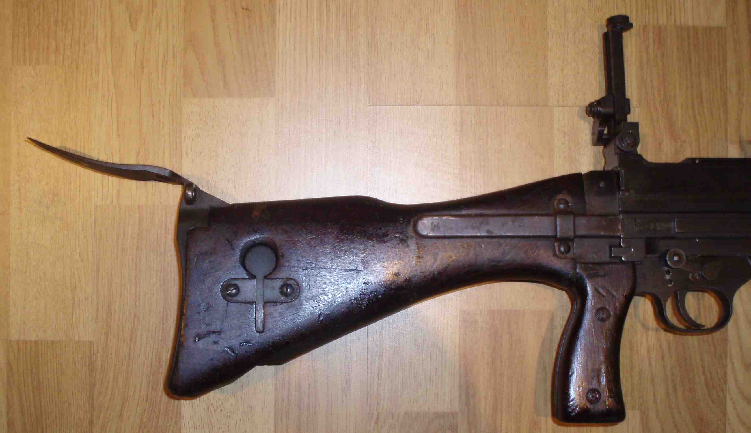 La crosse en bois, est percée d'un évidement longitudinal où vient prendre place un tube contenant le ressort récupérateur. Elle est équipée d'une épaulière articulée et peut recevoir une béquille.