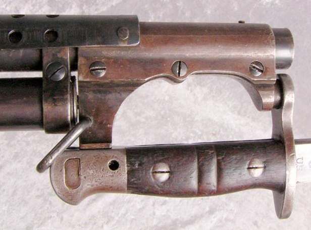 Le refroidisseur est en tôle perforée de trois séries de vingt-neuf trous. Il est rivé à un porte-baïonnette. Celui-ci est muni d'un guidon et d'un anneau de bretelle.